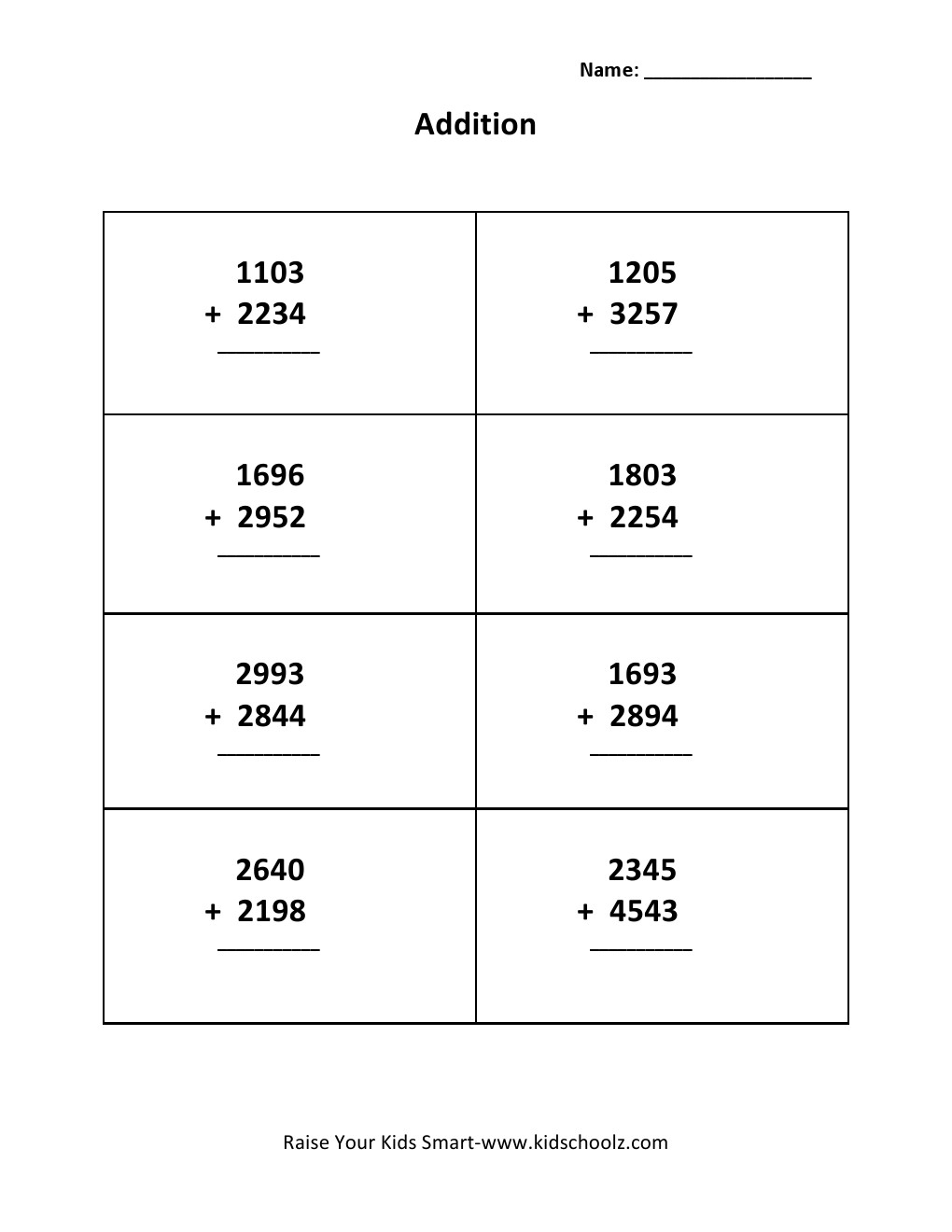 Grade 3 math worksheet - Addition: adding 4-digit numbers in columns ... Grade 3 Addition 4-digit #'s in columns Adding 4-digit numbers in columns Column form, numbers to 10,000 Our 3rd grade addition worksheets on adding two 4-digit numbers (1-9,999) in columns. Worksheet #1 Worksheet #2 Worksheet #3 Worksheet #4 Worksheet #5 Worksheet #6 5 More Similar: